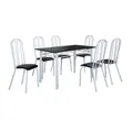 Conjunto de Jantar com tampo de vidro preto temperado e base em metal branca, composto por mesa retangular e 6 cadeiras com assentos estofados pretos. Design moderno, resistente e fácil de limpar, ideal para salas amplas, cozinhas integradas e ambientes contemporâneos. Perfeito para refeições em família e encontros com amigos, combinando conforto e elegância.